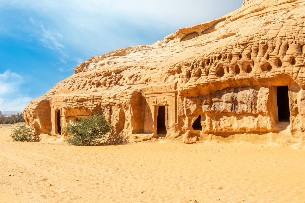 <Auf unserem Tagesprogramm steht ein weiteres UNESCO-Weltkulturerbe. Die Totenstadt Hegra stellt einen bemerkenswerten archäologischen Standort in Saudi-Arabien dar, der natürliche Schönheit, historische Bedeutung und kulturelles Erbe vereint. Mehrere Jahrhunderte beherrschten die Nabatäer die antiken Karawanenhandelsrouten zwischen dem Mittelmeer und Südarabien. In den sandigen Felsen gemeißelt, erzählen die 109 Gräber der historischen Stadt Hegra von der glorreichen Geschichte der Nabatäer. Am Nachmittag begeben wir uns auf weichem Sand durch die Wüste und erwandern die Landschaft von AlUla.