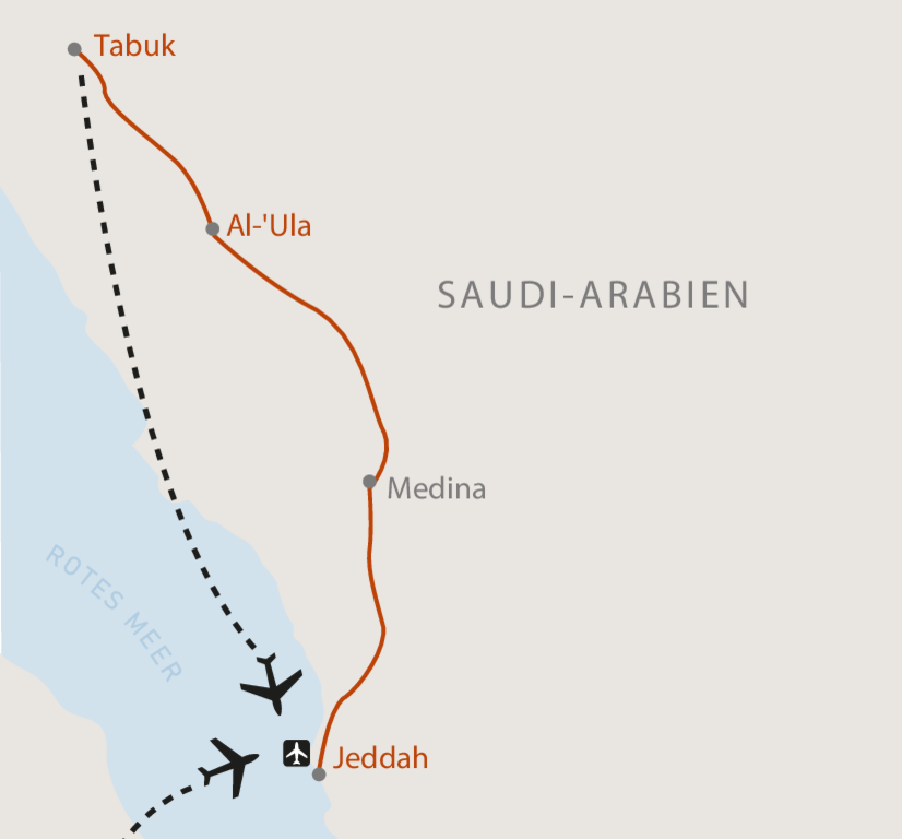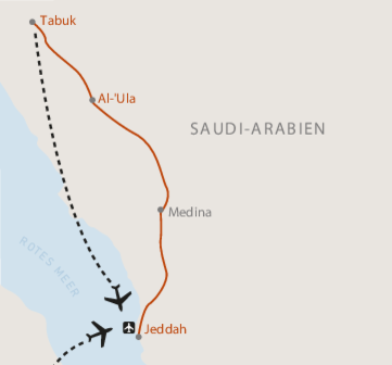 Eindrucksvolle Landschaften, kulturelle Vielfalt und eine faszinierende Geschichte – so präsentiert sich Saudi-Arabien! Mehrere Orte, die dem UNESCO-Weltkulturerbe zugehörig sind, stehen auf unserem Reiseprogramm. Wir erleben das pulsierende Jeddah mit seinen Museen und der historischen Altstadt. Ein weiteres Highlight sind die prachtvollen Moscheen Medinas und die archäologische Totenstadt Hegra. Wir wandern durch das malerische Tal "Wadi al Dissah" und spüren die endlose Weite der Wüste bei einer unvergesslichen Tour durch das Bajda-Gebiet. Diese Reise wird deine Sinne verzaubern und dich mit unvergesslichen Erinnerungen bereichern!
