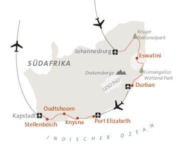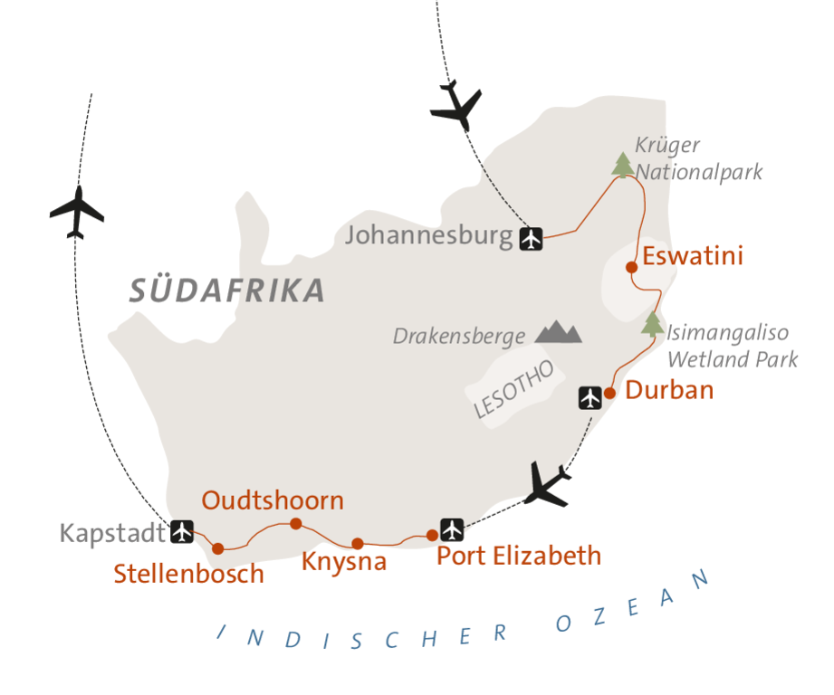 Südafrika ist ein wahres Juwel der Vielfalt. Die Weite der Landschaft, die beeindruckende Tierwelt und die Mischung aus Abenteuer und Entspannung machen es zu einem perfekten Ziel für Alleinreisende. Wir werden die majestätischen Tiere im Kruger Park erleben, den atemberaubenden Blyde River Canyon bestaunen und auf den Wanderwegen von Eswatini die Natur genießen. Die Küstenregion lädt uns ein, Pinguine zu beobachten und am Ozean zu wandern. Im Kap der Guten Hoffnung und auf dem Tafelberg werden wir beeindruckende Ausblicke erleben und das bunte Treiben der Metropole Kapstadt entdecken.