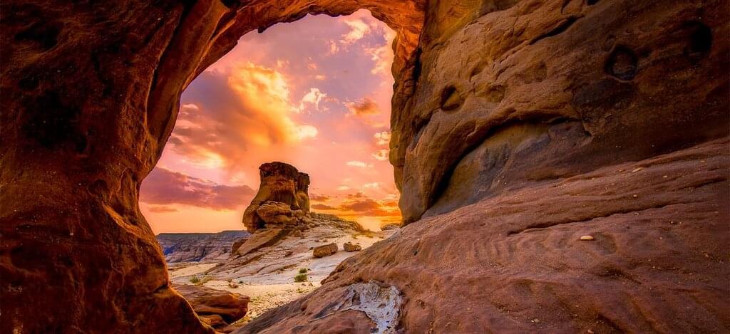 <Heute wirst du in die berühmte Tabuk Provinz fliegen. Diese Region hat eine lange Geschichte, in der sich Millionen von Pilgern aus Ägypten und Jordanien auf dem Weg nach Mekka ausgeruht haben. Die Landschaft hier ist wirklich beeindruckend und wartet darauf, von dir erkundet zu werden. In der Hisma Wüste findest du zahlreiche Aussichtspunkte und spektakuläre Felsformationen, die dich in ihren Bann ziehen werden. Gott sei Dank bieten die Felsen auch Schatten, was dir die Möglichkeit gibt, einen entspannten Spaziergang zu machen und versteckte Orte zu entdecken. Während dieses Spaziergangs versuche still zu sein, um die Geräusche oder sogar die Stille der Wüste zu hören! Und natürlich darf ein romantischer Höhepunkt nicht fehlen: Der malerische Sonnenuntergang in dieser Kulisse wird dich verzaubern und dir unvergessliche Momente bescheren. Lass dich von dem Wunder der Natur faszinieren und in orientalischen Träumen schwelgen.