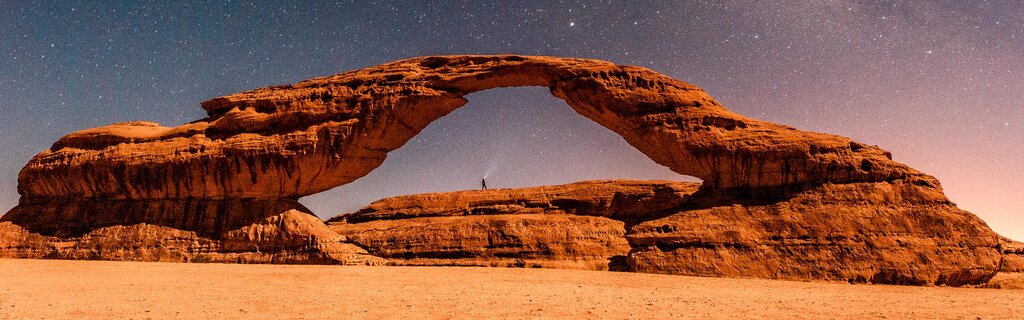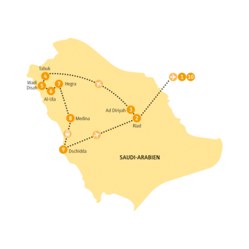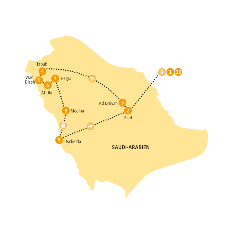 Eine andere Welt? Zum Glück nicht, sonst bräuchten wir Raumschiffe. Doch anders ist es schon in Riad, wo der Ruf des Muezzins durch die Straßenschluchten der kleinen Gassen und blitzenden Wolkenkratzer schwebt. Wo nicht weit entfernt mit Medina und Mekka die heiligsten Pilgerstädte des Islam zu finden sind. Wo die karge Schönheit von Wadi Disah und ewige Sanddünen locken, zu Sonnenaufgang mit Lagerfeuerfrühstück im Stile der Nomaden. Wo wie in Hegra kulturelle Schätze aus Tausenden von Jahren warten und in Dschidda modernster Luxus am Meer.