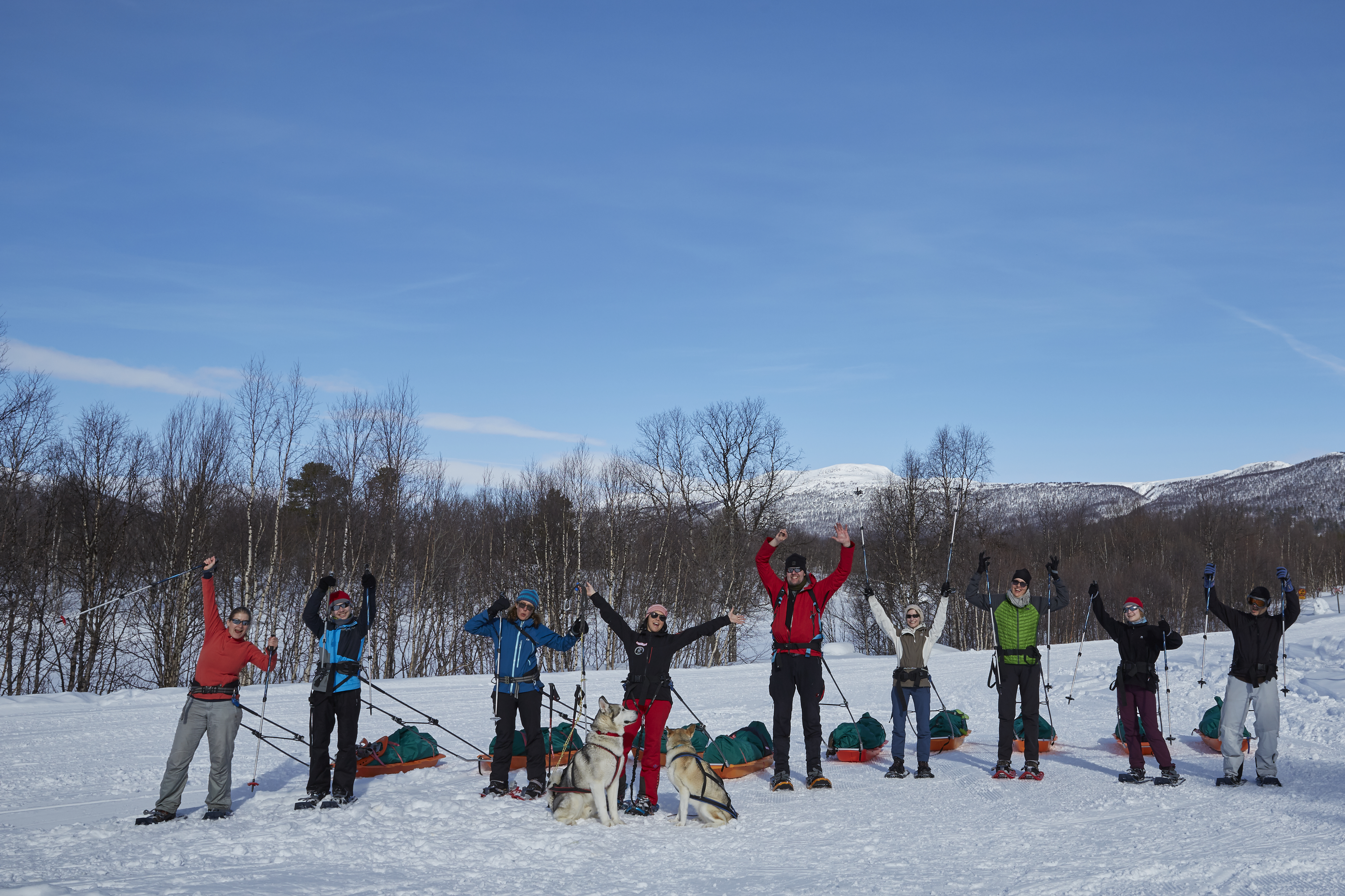 <Heute unternehmen wir eine Tagestour ins Hochgebirge, die Hunde sind immer dabei. Die Pulkas lassen wir bei der Hütte und wandern mit leichtem Tagesgepäck. Uns erwartet dort eine gigantische Aussicht auf den Vindelälven und viele schneebedeckte Berggipfel, weite Täler, die unendlich erscheinen. Nach der Rückkehr in die Hütte Rävfallet, können wir uns in der holzbeheizten Sauna aufwärmen und entspannen. -
