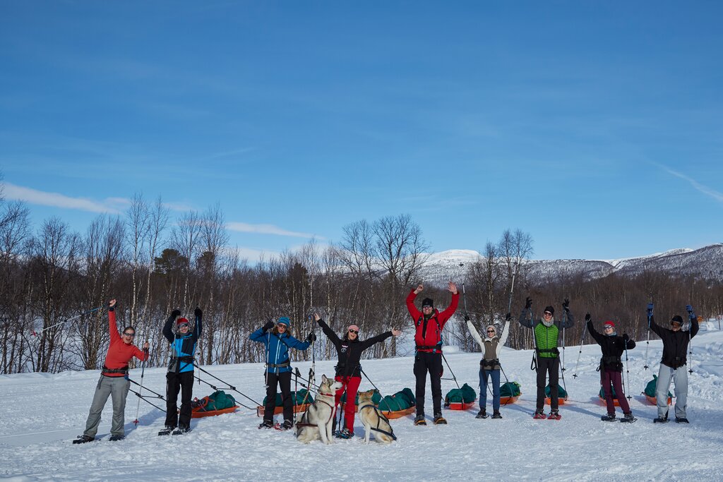 Mit Schneeschuhen absolvieren wir unsere Tagesetappen, die zwischen 9 und 16 km liegen. Unsere Gepäck befördern wir in Pulkas. Nur das Tagesgepäck tragen wir in einem leichten Rucksack auf dem Rücken. Es gibt keinen Gepäcktransport. Alles, was Sie während des Trekkings nicht benötigen, können Sie im Gästehaus verstauen.