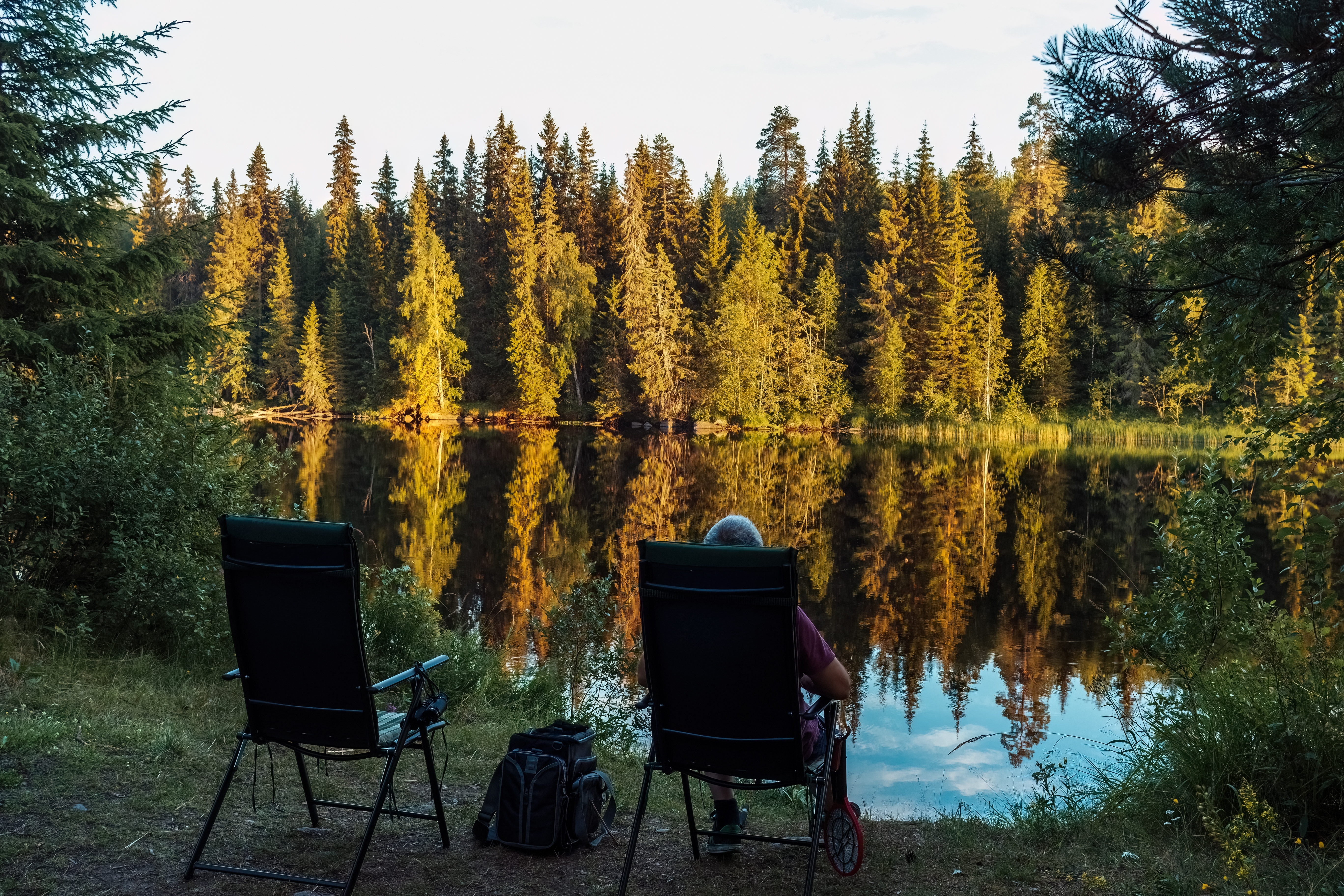 <Heute ist unser letzten Tourtag, den wir in vollen Zügen genießen. Es geht zurück zum Parkplatz. Wir erreichen wieder den Wald und steigen durch teilweise steileres Gelände ab zum Vindelälven, den wir auf einer kleinen Brücke überqueren können.
