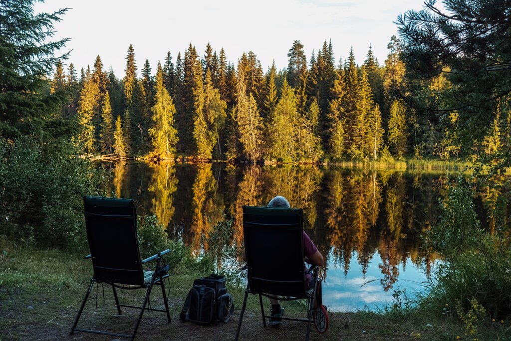 <Wir fahren nach Ammarnäs, ein kleines samisches Dorf am Rande des Vindelfjälls. Von dort aus starten wir unsere Tour. Entlang des Flusses Vindelälven, durch den naturbelassenen Birkenwald. Wir wandern vorbei an einer markanten Steilwand, in der häufig Steinadlerpärchen brüten und ihre Jungen großziehen. Am Nachmittag erreichen wir unseren ersten Übernachtungsplatz, der direkt am Fluß liegt.