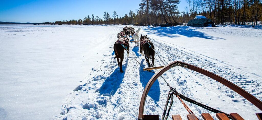 <Du stehst bereits im dünn besiedelten Teil Lapplands, denn zwei Prozent der schwedischen Bevölkerung lebt auf 50 Prozent der Landesfläche. Hier entsteht tatsächlich ein Gefühl von Europas Alaska. Es heißt zu Recht, in manchen Teilen von Schwedisch-Lappland gäbe es mehr Huskys als Menschen. Heute hast du die Gelegenheit, diese besondere Hunderasse näher kennenzulernen. Gleich nach dem Frühstück geht es zu einer Huskyfarm in der historischen Provinz Lappland, wo 36 Alaskan Huskys und ein waschechter Musher (Hundeschlittenführer) zu Hause sind. Huskys sind äußerst sanftmütige und intelligente Schlittenhunde, zudem sehr menschenfreundlich. Selbst Personen, die nicht unbedingt Hundefreunde sind, kommen gerade mit Huskys gut klar. Dein Hundeschlittenführer Morgan ist mit dem seltenen Zertifikat »Natures Best« ausgezeichnet. Dieses garantiert den artgerechten Umgang mit Huskys. Und man sieht es ihnen an, die Tiere fühlen sich in diesem Klima »pudelwohl«. Nachdem du die Tiere ein wenig kennengelernt und beim Anlegen des Geschirrs geholfen hast, geht es los! Auf einer erprobten Strecke durch Wälder, über zugefrorene Seen und Moore fährst du mit dem Hundeschlitten durch die typische Landschaft Lapplands. Du fährst im sogenannten Duo-Drive und wechselst dich unterwegs beim Führen des Schlittens ab. Eine Besonderheit sind übrigens die Sitze im Hundeschlitten, die im Vergleich zu anderen Anbietern hinsichtlich Sicherheit und Komfort einzigartig sind. Gut vier Stunden verbringst du auf der Huskyfarm. Am Nachmittag bist du zurück in Lycksele.