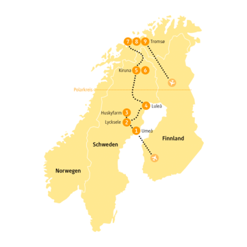 <Mit einem Koffer voller Vorfreude fliegst du nach Umeå. Die nordschwedische Metropole liegt an der schwedischen Ostseeküste des Bottnischen Meerbusens »Kvarken« (UNESCO-Weltnaturerbe). Nach der Ankunft am Flughafen wirst du per Bus oder Taxi zu deinem Hotel gebracht. Je nach Ankunftszeit kannst du Umeå bereits heute auf eigene Faust entdecken. Wie wäre es mit einem Spaziergang an der Strandpromenade, entlang des gefrorenen Flusses Umeälven? An ungemütlichen Tagen warten in der Innenstadt zahlreiche Cafés auf deinen Besuch. Vor dem Abendessen lernst du deine Mitreisenden und deine Reiseleitung kennen, die dich auf deiner Winterreise quer durch Schwedisch-Lappland und Europas Arktis begleiten.