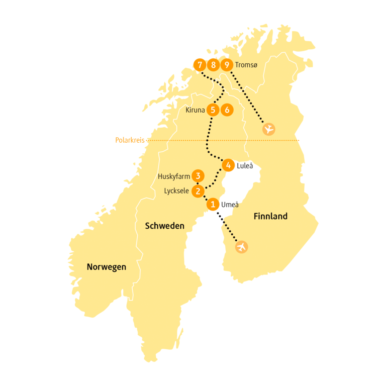 Unsere Gäste reisen von verschiedenen Flughäfen in Deutschland, Österreich und der Schweiz an und damit auch zu unterschiedlichen Zeiten. Je nach Ankunft deines Fluges und damit du am Flughafen von Umeå keine langen Wartezeiten hast, wirst du entweder als Gruppe mit einem privaten Bus abgeholt oder wir buchen für dich einen individuellen Taxitransfer zum Hotel. Alle Informationen dazu findest du in deinen finalen Reiseunterlagen unter dem Punkt »Abholung am Zielflughafen bzw. wichtige Transferinformation«.