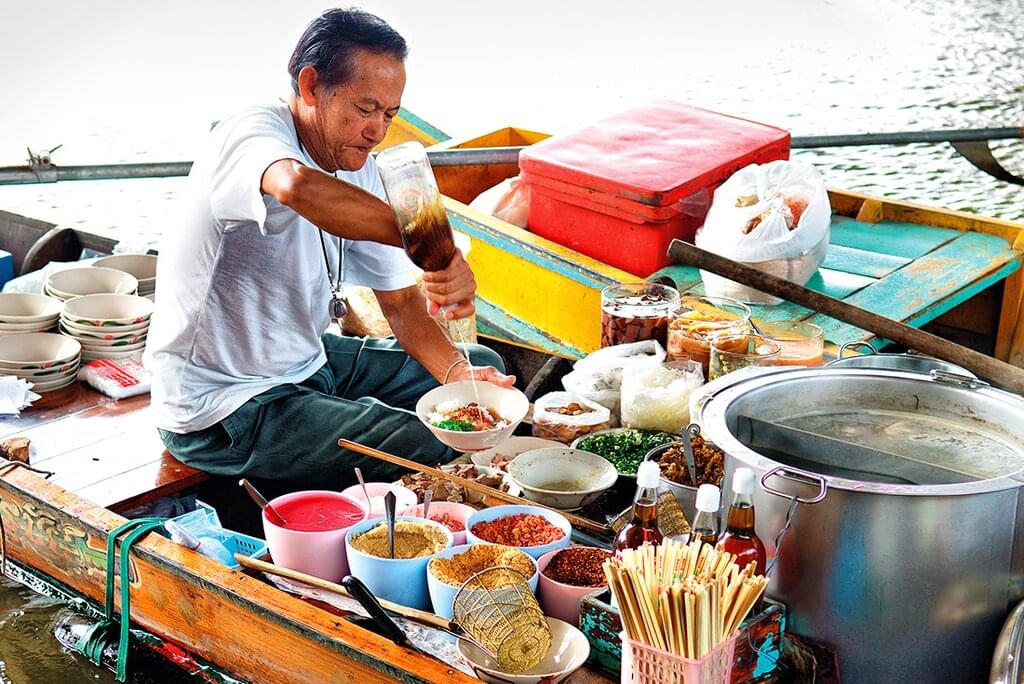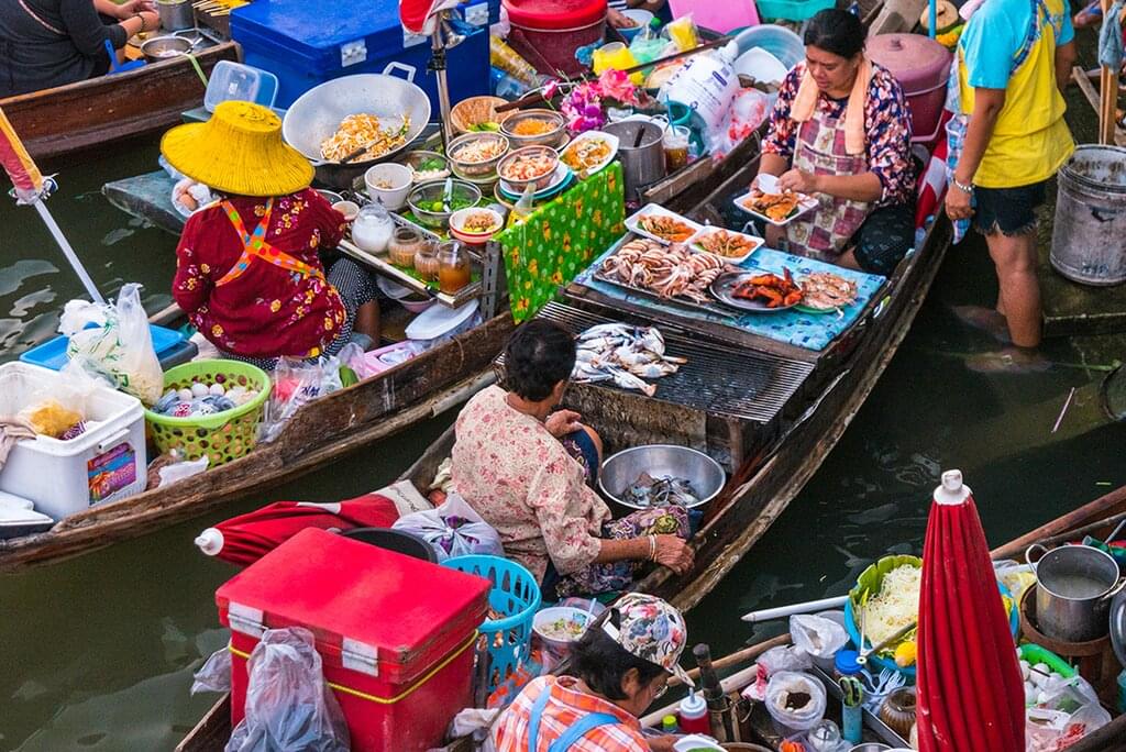 <Nach einem frühen Frühstück besuchst du den schwimmenden Markt von Tha Kha. Spaziere an den Kanälen vorbei, in denen die Verkäufer ihre Früchte und Waren feilbieten, und besteige dann ein Tretboot, um die Wasserwege weiter zu erkunden. Die Gegend ist bekannt für die Produktion von Kokospalmenzucker, und du kannst dir in einem Betrieb am Flussufer ansehen, wie er hergestellt wird. Danach fährst du zurück nach Bangkok, wo du den Nachmittag zur freien Verfügung hast, um einzukaufen, Sehenswürdigkeiten zu besichtigen oder einfach zu entspannen. Heute Abend machst du einen Rundgang durch Chinatown. Hier kannst du einheimisches Street Food probieren, also frag deinen Reiseleiter nach seinen Tipps und Empfehlungen. Vielleicht hast du auch Lust, mit anderen Mitgliedern deiner Gruppe in einer der lebhaften Bars Live-Musik zu hören. -