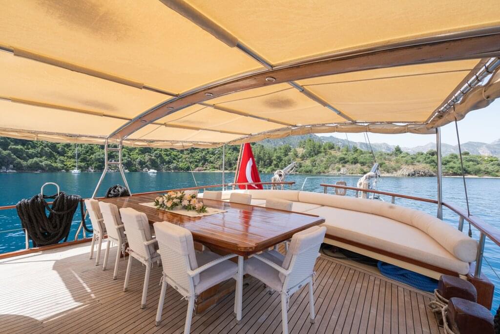 <Hoş geldin! Willkommen in der Türkei. Dein Abenteuer beginnt in der belebten Stadt Fethiye, wo du um 14 Uhr an Bord deines wunderschönen türkischen Gullet (eine klassische Holzjacht von der Südwestküste der Türkei) gehst. Es empfiehlt sich, ein paar Tage früher anzureisen, um alles zu erkunden, was Fethiye zu bieten hat, und um sicherzugehen, dass du pünktlich an Bord bist, denn deine Segelreise wird sofort beginnen! Nach einem Willkommenstreffen, bei dem du deine Mitreisenden kennenlernst, erhältst du eine Einweisung in das, was dich in den nächsten acht Tagen auf dem Schiff erwartet. Dann segelst du nach Tarzan Bay. Wenn du dort ankommst, kannst du zum ersten Mal in das kristallklare Wasser der Bucht springen und schwimmen gehen. Iss mit der Gruppe zu Abend und verbringe deine erste Nacht an Bord, während du zum sanften Schaukeln der Wellen einschläfst.