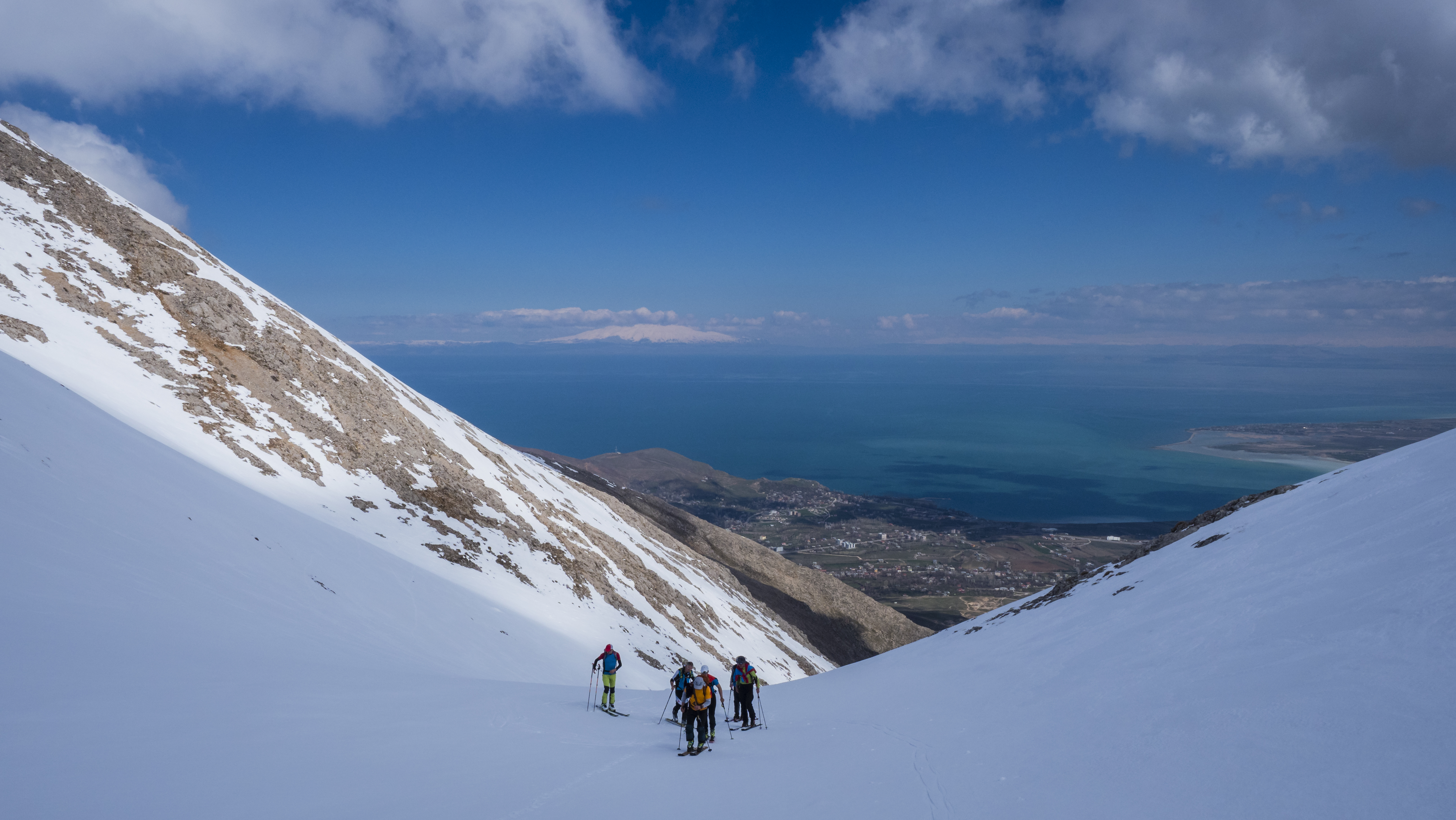 <Morgens Fahrt nach Gevas am Van See und weiter zum letzten Dorf am Fuße des Berges, 2.100 m (je nach Schneelage sogar darunter). Etwa 4 Stunden brauchen wir bis zum Gipfel - der Ausblick über den Vansee ist einzigartig. Rassige Abfahrt mit einer maximalen Steilheit von bis zu 30°. Fahrt nach Adilcevaz, Nächtigung im Hotel.