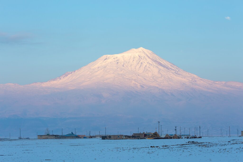 „Und Noahs Arche stand still auf dem Berg Ararat“. Mit dieser Aussage hat die Bibel den formschönen Vulkankegel in aller Welt berühmt gemacht. Ganz im Osten der Türkei, hoch über der ostanatolischen Steppe, schwebt seine Krone aus Eis und Schnee im Blau des Himmels. Unabhängig von der biblischen Bedeutung des Ararat strahlt der Vulkankegel (letzter Ausbruch 1840) eine gewaltige Faszination aus. Hier, im Ostanatolien, vereinigen sich die Ausläufer des Taurusgebirges mit den Ostausläufern des Pontius Gebirges in einer weiten Hochebene. Aus diesem 1700 m hohen Plateau türmt sich der Ararat mächtig und freistehend über 3000 m empor. Selbst im Hochsommer ist die Kuppe eisbedeckt, die Flanken des Vulkans vegetationslos. Wolkenfelder unterhalb des Gipfels lassen den Kollos wie schwebend erscheinen.