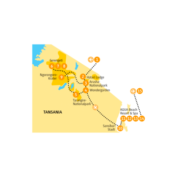 - 12 Übernachtungen in Lodges und Zeltcamps während der Safari sowie in einem Hotel in der Altstadt und in einem exklusiven Strandresort auf Sansibar