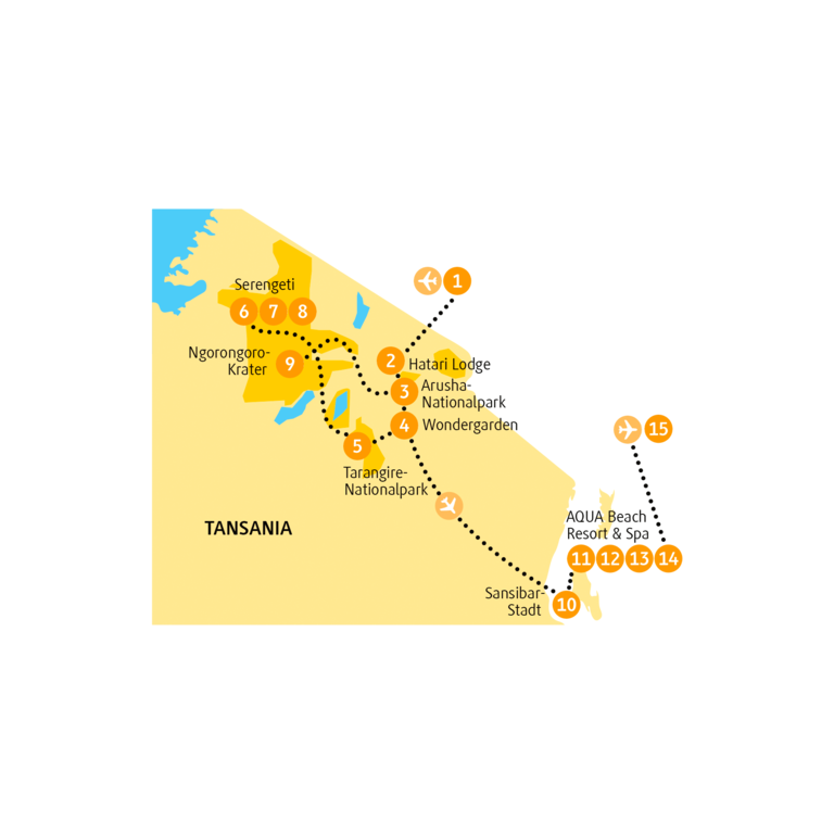 Es passiert nicht oft, dass du einen Urlaub buchst und drei bekommst. In Tansania geht das: Einen für unsere Safaris im Tarangire-Nationalpark, im Weltnaturerbe Serengeti und im Ngorongoro-Krater, der Heimat von 25.000 Tieren. Einen für die mondscheinhellen Nächte in den Camps der Wildnis, die auch nachts nicht schläft. Und einen dritten, der gepfeffert ist: Am schönsten, kuschelwarmen Sandplatz der Gewürzinsel Sansibar: Verwöhnt unter Palmen im AQUA Beach Resort & Spa.