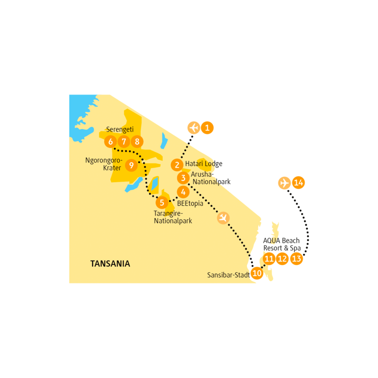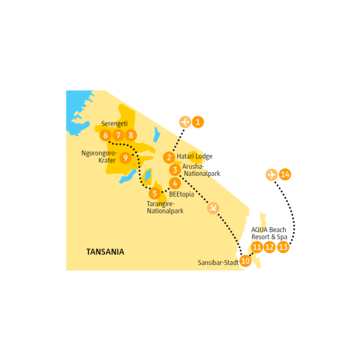 - 11 Übernachtungen in Lodges während der Safari sowie in einem Hotel in der Altstadt und in einem exklusiven Strandresort auf Sansibar