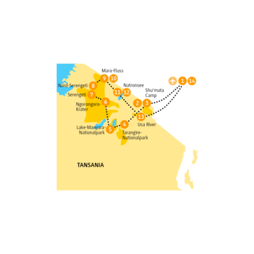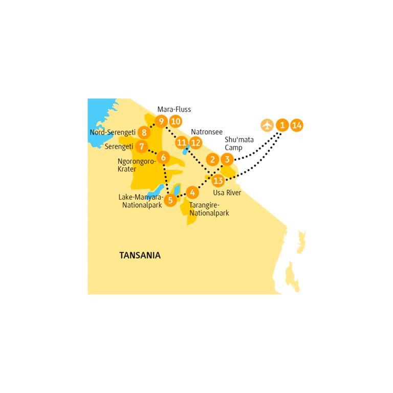 - 10-tägige Safari durch die schönsten Nationalparks in Tansania mit Schwerpunkt Serengeti und Mara-Fluss, Kaffeetour am Fuße des Mount Meru, 3 Safaris zu Fuß: in der Serengeti, am Natronsee und beim Shu’mata Camp