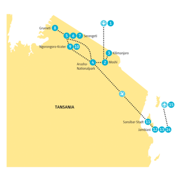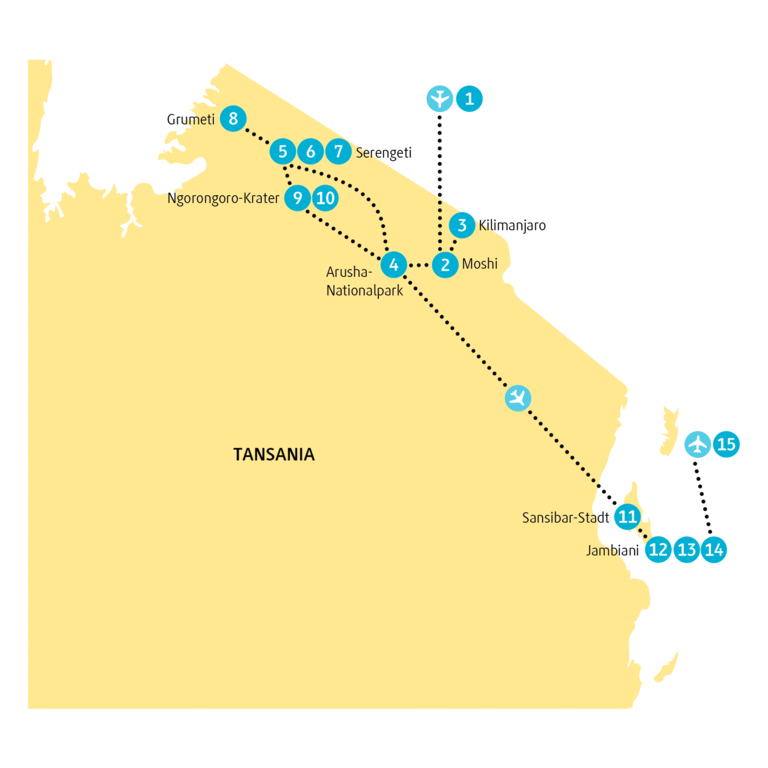 - 12 Übernachtungen in Hotels und Zeltcamps während der Safari sowie in einem Hotel in der Altstadt und in einem exklusiven Strandresort auf Sansibar
