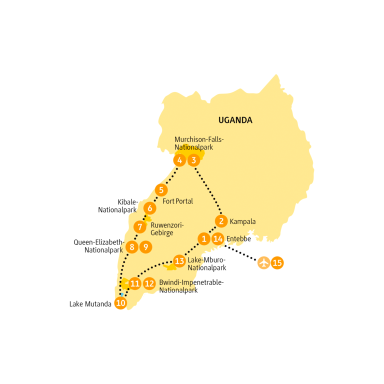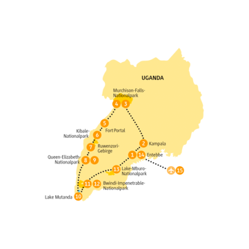 - 4 Safaris im Geländewagen; 2 Bootsfahrten: auf dem Victoria-Nil und auf dem Kazinga-Kanal; 1 Safari zu Fuß im Lake-Mburo-NP