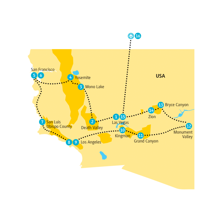 Unendliche Weiten? Kannst du haben, auf deinem Walk of Fame von Vegas nach Frisco und zurück! Bäume und Menschen gibts nicht so viele in Nevada, Utah, Arizona und Kalifornien, dafür schroffe Schönheiten vom Grand Canyon bis zum Monument Valley, meditative Fahrten durch das Death Valley und skurrile Mondlandschaften. Und damit wir nicht vereinsamen, halten wir auch in Los Angeles und in Sand Francisco.