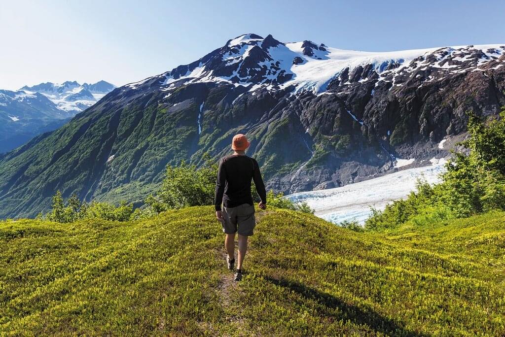 <Heute Morgen machst du eine malerische Fahrt auf der Kenai-Halbinsel von Homer nach Seward. Wenn du kannst, solltest du dir einen Fensterplatz sichern, denn bei klarem Wetter hast du einen herrlichen Blick auf die türkisfarbenen Seen in der Nähe des Moose Pass sowie auf die Berge und Vulkane in der Ferne. In Moose Pass kannst du eine optionale Kajaktour unternehmen. Wenn du heute Nachmittag in Seward ankommst, kannst du eine kurze Wanderung zur Zunge des Exit Glacier im Kenai Fjords National Park unternehmen. Dieser elektrisch blaue Gletscher ist eine der am besten zugänglichen Talgletscher Alaskas und eine der Hauptattraktionen des Parks. Danach checkst du in dein Hotel in Seward ein und hast den Abend zur freien Verfügung, um die Stadt zu erkunden oder in einem lokalen Restaurant zu Abend zu essen und etwas zu trinken.
