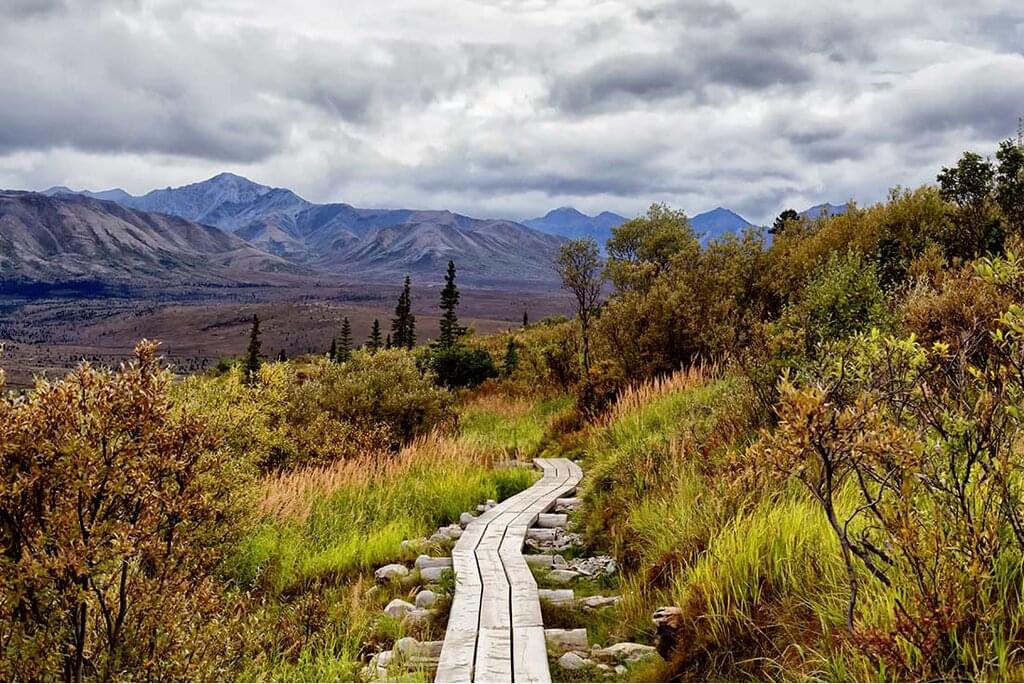 <Die heutige Wanderung beginnt damit, dass du dich durch den Fichtenwald schlängelst, während du den spektakulären Triple Lakes Trail wanderst - den längsten Weg im Denali National Park, der dir großartige Ausblicke auf den Riley Creek bietet. Mit den hoch aufragenden Bergen in der Ferne wanderst du entlang von Bächen, Wäldern und sanften Hügeln, bevor der erste der drei Triple Lakes in Sicht kommt. Von hier aus kannst du entweder weiterwandern (wenn die Zeit es zulässt) oder zum Ausgangspunkt zurückkehren, um den Abend im Hotel zu verbringen. Wer noch mehr vom Park sehen möchte, kann auf die heutige Wanderung verzichten und für die ganztägige Tundra Wilderness Bustour bezahlen, bei der du die unglaubliche Landschaft des Toklat River und einige der besten Wildtierbeobachtungen des Parks erleben kannst.