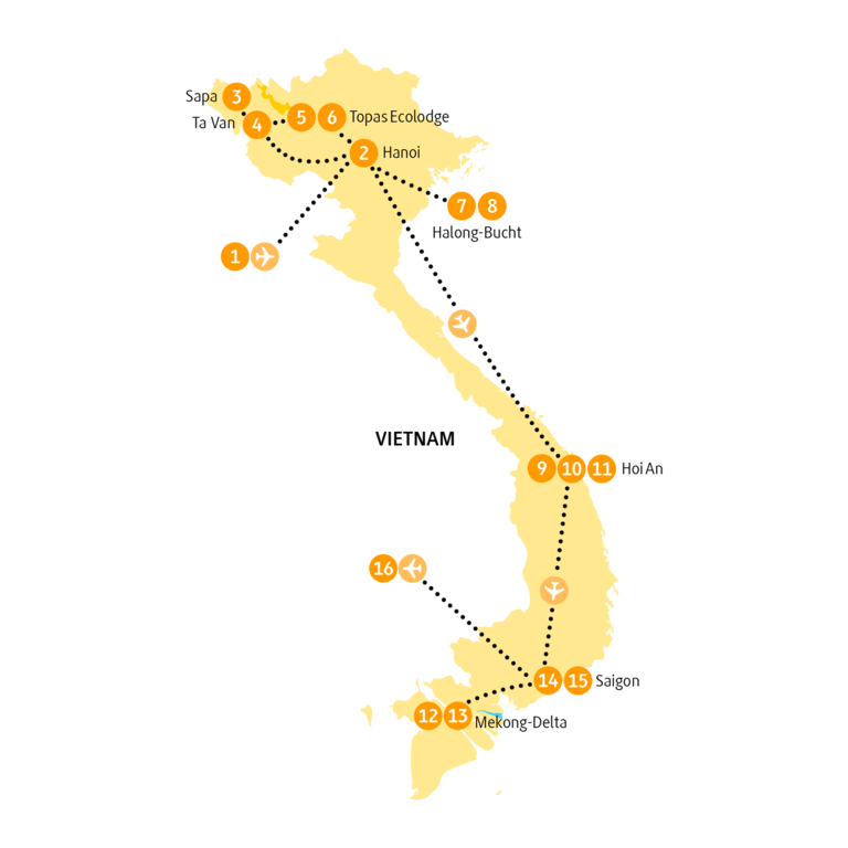 • Linienflug mit Vietnam Airlines (Tarif T) ab/bis Frankfurt. Andere Flughäfen mit Aufpreis möglich.