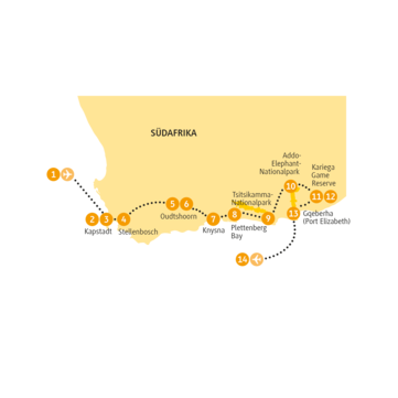 <Wenn das Wetter es zulässt, fährst du heute mit der rundum verglasten Seilbahn auf den Tafelberg. Aus über 1.000 Metern Höhe hast du einen großartigen Blick auf die Metropole, Robben Island und unzählige Strände. Im District-Six-Museum erfährst du geschichtliche Hintergründe der Apartheid. Vorbei an grünen Weinfeldern und namhaften Weingütern gelangst du nach Stellenbosch, Heimat der größten südafrikanischen Weingenossenschaft. Welche Aufgaben hat eine Winzerin oder ein Winzer überhaupt? Bei einer Führung über das Jordan Weingut erfährst du einiges über dessen traditionsreiche Geschichte, über den zum Weinanbau hervorragend geeigneten Boden und über das Winzer-Team selbst, das seiner Arbeit mit Leidenschaft nachgeht. Zum Abschluss des Rundgangs wird dir bei herrlicher Aussicht über die Rebstöcke eine Weinprobe kredenzt. Im Ortskern von Stellenbosch spazierst du die berühmte Dorp Street entlang, die Straße mit den meisten denkmalgeschützten Gebäuden in Südafrika, und besichtigst das Dorfmuseum sowie den Krämerladen »Oom Samie se Winkle«.