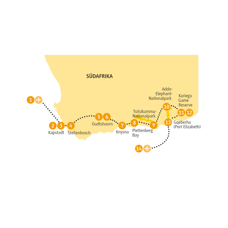 In Kapstadt ist noch nicht viel mit Garden Route. Da tobt der Atlantik ums Cape of Good Hope und die Landschaft ist noch dramatischer als ein Abend an der Victoria & Alfred Waterfront. Seelenruhe dagegen in den Wineyards von Stellenbosch, in der Straußenheimat Oudtshoorn, der blauen Lagune von Knysna, den feinsandigen Himmelbetten der Plettenberg Bay und dem schönsten Nationalpark der Garden Route, im Tsitsikamma. In Reserve: 650 Elefanten im Addo und die Big Five im Kariega Game Reserve.