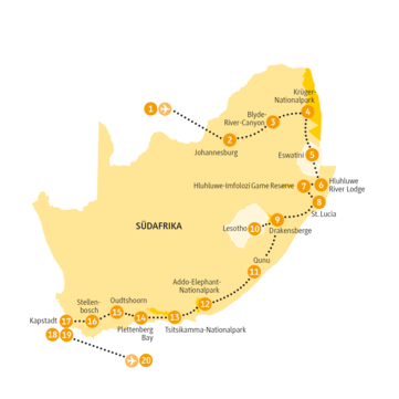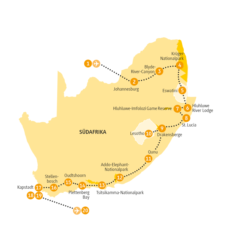 Panorama ist weit untertrieben, genau genommen ist es ein hoch emotionaler Blick auf das halbe Südafrika. Beginnt mit dem Blyde-River-Canyon und God’s Window. Dann das Programm deines Lebens: Big Five im Krüger. Das Königreich Eswatini. 1.600 Breitmaulnashörner. Drakensberge. Kingdom of the Sky Lesotho. Gänsehaut-Nationalpark Tsitsikamma. Plettenberg Bay. Das Straußen-Eldorado Oudtshoorn. Die Wine Yards von Stellenbosch und ein finale grosso mit Herzklopf-Garantie in Kapstadt.