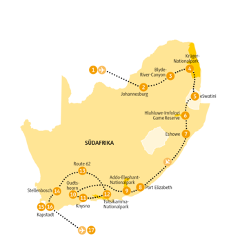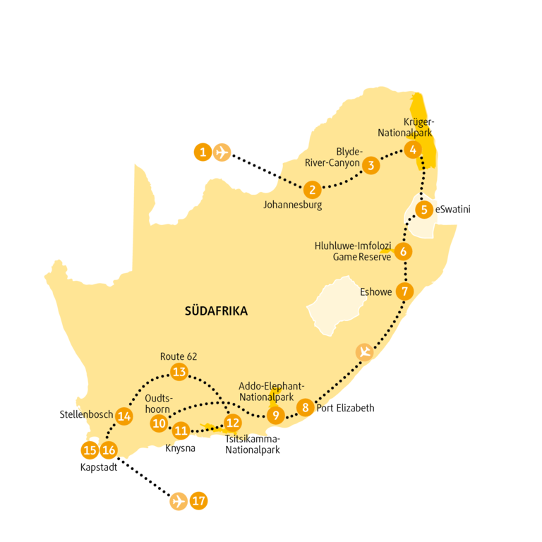 Auf das gewaltige Naturdrama Blyde-River-Canyon folgt das emotionale Beben: Big Five im Krüger-Nationalpark. Da verschafft uns König Misuzulu Zulu kaZwelithini im Zululand eine Atempause, bevor die 1.600 Breitmaulnashörner im Hluhluwe-Imfolozi Game Reserve kommen. Die Elefanten im Addo-Nationalpark warten auch schon. Oudtshoorn noch und Knysna auf der Garden Route, dann führt uns die berühmte Route 62 in die Wineyards von Stellenbosch und Kapstadt in den erlebten Wahnsinn.
